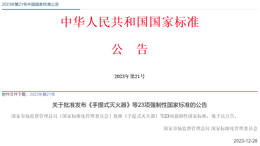 關(guān)于批準(zhǔn)發(fā)布《手提式滅火器》等23項(xiàng)強(qiáng)制性國(guó)家標(biāo)準(zhǔn)的公告