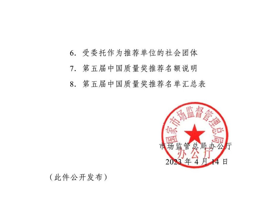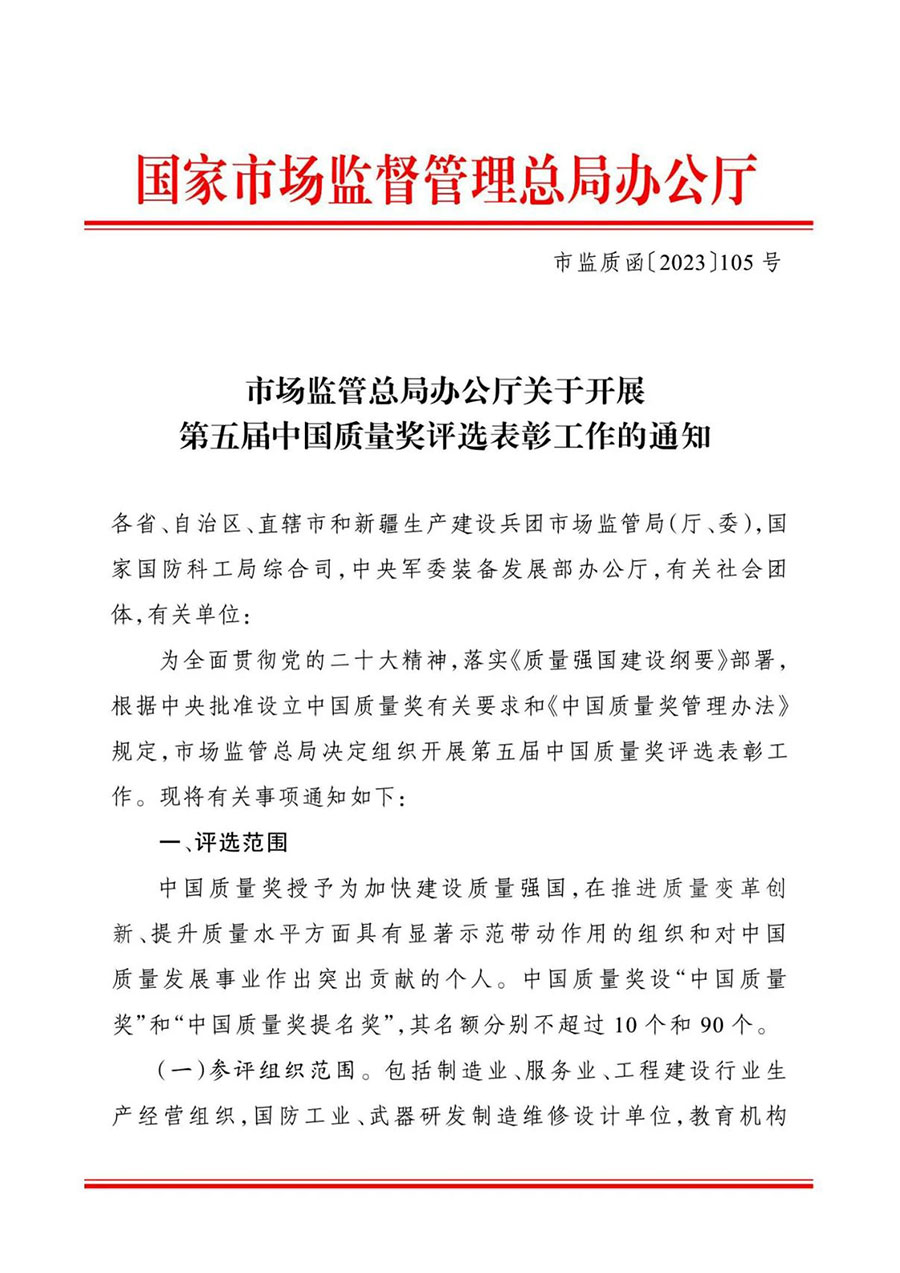 為全面貫徹黨的二十大精神,落實(shí)《質(zhì)量強(qiáng)國建設(shè)綱要》部署,根據(jù)中央批準(zhǔn)設(shè)立中國質(zhì)量獎(jiǎng)有關(guān)要求和《中國質(zhì)量獎(jiǎng)管理辦法》規(guī)定,市場監(jiān)管總局決定組織開展第五屆中國質(zhì)量獎(jiǎng)評(píng)選表彰工作。現(xiàn)將有關(guān)事項(xiàng)通知如下: