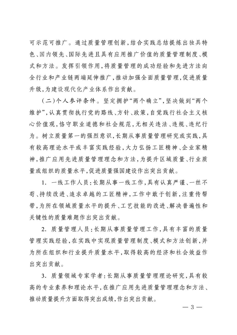 (二)個(gè)人參評(píng)條件。堅(jiān)定擁護(hù)“兩個(gè)確立”,堅(jiān)決做到“兩個(gè)維護(hù)”,認(rèn)真貫徹執(zhí)行黨的路線、方針、政策,自覺踐行社會(huì)主義核心價(jià)值觀,恪守職業(yè)道德和社會(huì)規(guī)范,無相關(guān)違法、違規(guī)、違紀(jì)行為。樹立質(zhì)量第一的強(qiáng)烈意識(shí),長期從事質(zhì)量管理研究或?qū)嵺`,具有較高理論水平或豐富實(shí)踐經(jīng)驗(yàn),大力弘揚(yáng)工匠精神、企業(yè)家精神,推廣應(yīng)用先進(jìn)質(zhì)量管理理念和方法,為提升區(qū)域質(zhì)量、行業(yè)質(zhì)量或組織的質(zhì)量水平,促進(jìn)質(zhì)量強(qiáng)國建設(shè)作出突出貢獻(xiàn)。