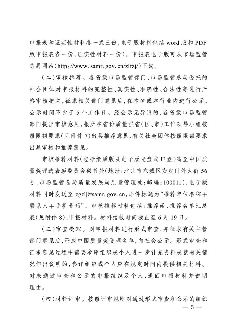 審核推薦材料(包括紙質(zhì)版及電子版光盤或U盤)寄至中國質(zhì)量獎(jiǎng)評(píng)選表彰委員會(huì)秘書處(地址:北京市東城區(qū)安定門外大街56號(hào),市場監(jiān)管總局質(zhì)量發(fā)展局質(zhì)量管理處;郵編:100011),電子版材料同時(shí)發(fā)送至zgzlj@samr.gov.cn,郵件標(biāo)題為“推薦單位名稱+聯(lián)系人+手機(jī)號(hào)碼”。審核推薦材料包括:推薦函、推薦名單匯總表(見附件8)、申報(bào)材料。材料接收時(shí)間截止至6月19日。