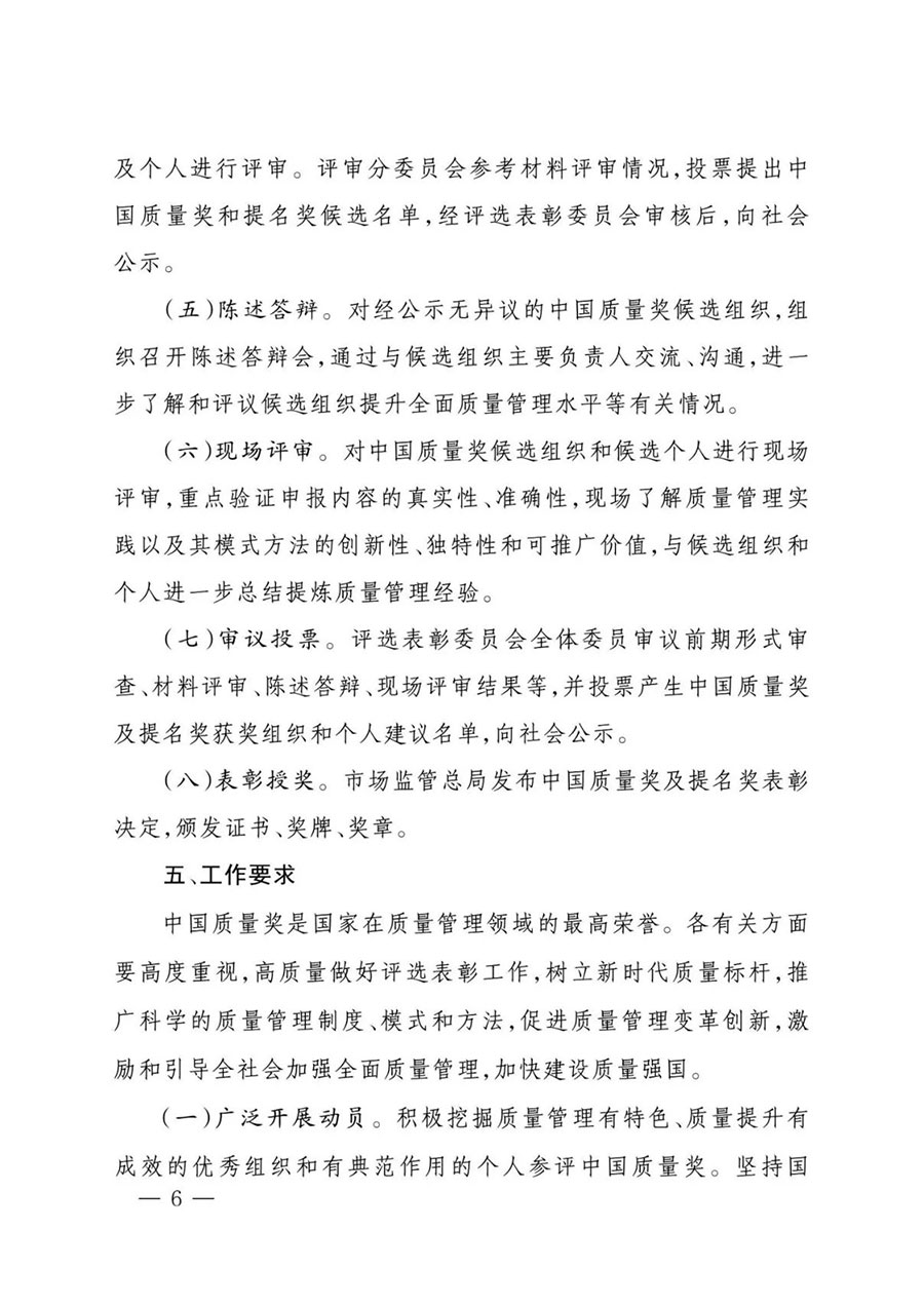 (六)現(xiàn)場評(píng)審。對(duì)中國質(zhì)量獎(jiǎng)候選組織和候選個(gè)人進(jìn)行現(xiàn)場評(píng)審,重點(diǎn)驗(yàn)證申報(bào)內(nèi)容的真實(shí)性、準(zhǔn)確性,現(xiàn)場了解質(zhì)量管理實(shí)踐以及其模式方法的創(chuàng)新性、獨(dú)特性和可推廣價(jià)值,與候選組織和個(gè)人進(jìn)一步總結(jié)提煉質(zhì)量管理經(jīng)驗(yàn)。