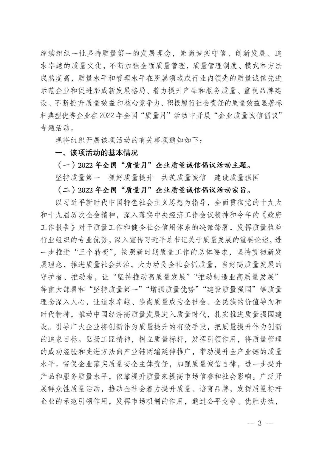 (央視新聞聯(lián)播9月1日報道) 2022年全國“質量月”活動拉開帷幕。中共中央政治局常委、國務院總理李克強作出重要批示。批示指出:質量是立業(yè)之本、強國之基,事關民生福祉。各地區(qū)、各有關部門要以習近平新時代中國特色社會主義思想為指導,認真貫徹黨中央、國務院決策部署,牢固樹立質量第一意識,推動經濟發(fā)展不斷提高質量效益。要加強政策引導,深入推進全面質量管理,優(yōu)化產業(yè)鏈供應鏈質量管理。引導企業(yè)弘揚工匠精神,落實主體責任,走以質量取勝的路子,著力依靠創(chuàng)新推進質量攻關,打造集質量、標準、技術、品牌等于一體的高品質產品和服務,在市場競爭中鍛就中國質量、培育中國精品。要聚焦民生關切,創(chuàng)新監(jiān)管方式,堅持對質量安全問題“零容忍”,開展質量惠民行動,更好滿足人民群眾需求。要提升服務效能,廣泛開展質量管理等技術服務,助力企業(yè)不斷增強質量發(fā)展能力。各方面共同努力,深入實施質量強國戰(zhàn)略,為經濟社會高質量發(fā)展和國家現(xiàn)代化建設作出更大貢獻。