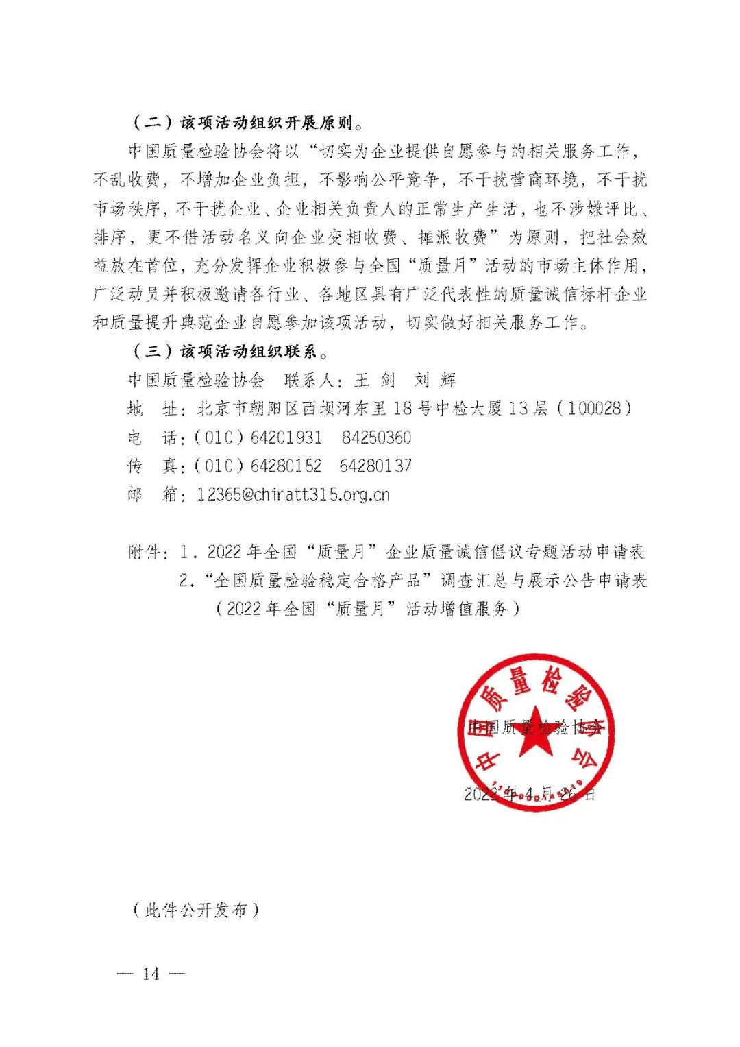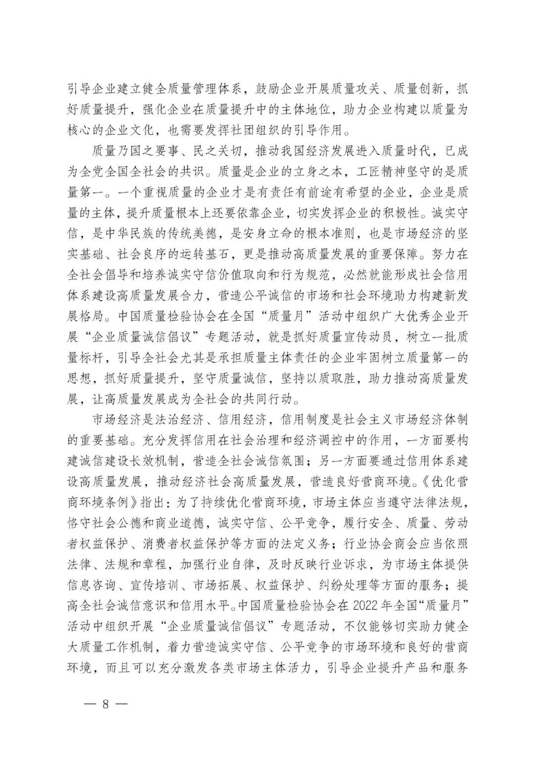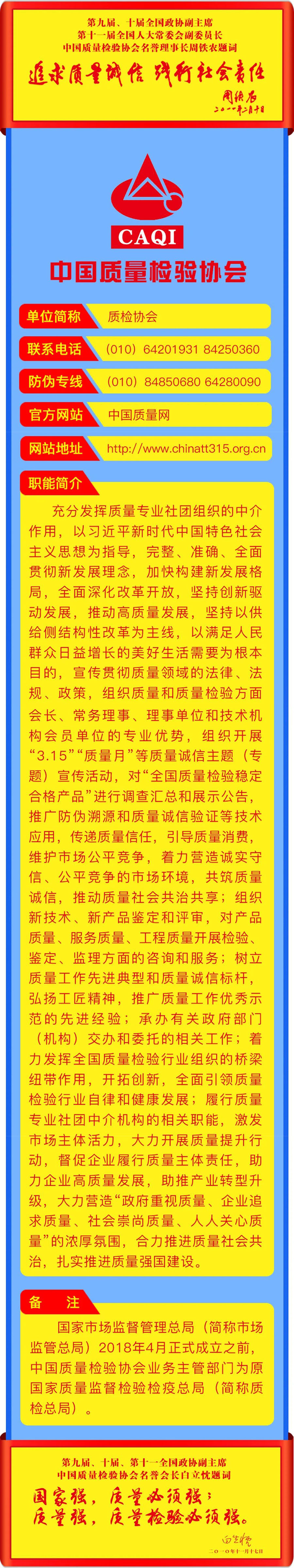 李克強總理批示指出,打造集質量、標準、技術、品牌等于一體的高品質產品和服務,在市場競爭中鍛就中國質量、培育中國精品。倡導企業(yè)對產品和服務質量作出誠信倡議,也是中國質量檢驗協(xié)會自2004年以來組織開展全國“質量月”企業(yè)質量誠信倡議專題活動的要義。謹期社會各界共同努力,推進質量社會共治,抓好產品和服務的高品質質量提升,共同為我們的質量強國事業(yè)去奮斗!