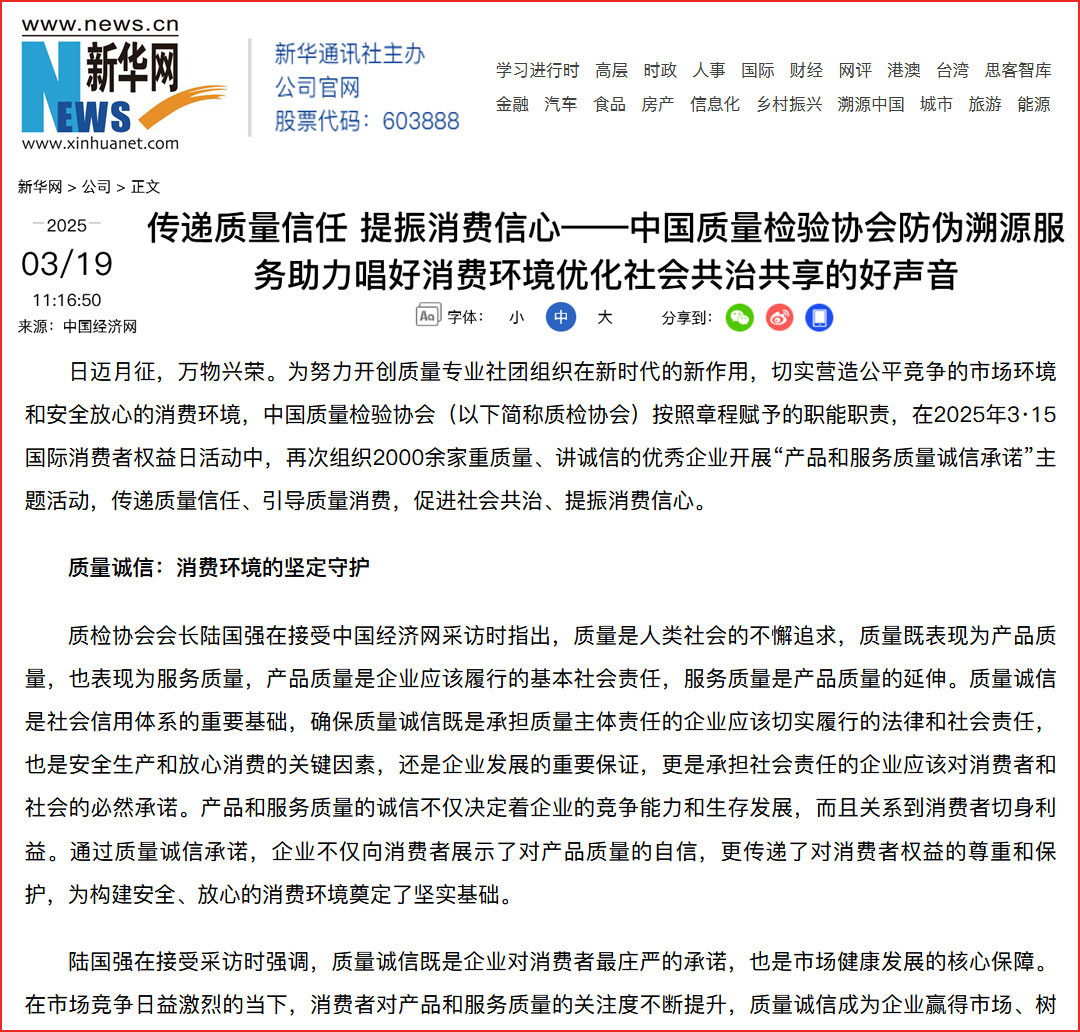 中國經(jīng)濟網(wǎng)“質(zhì)量經(jīng)濟頻道”發(fā)布:質(zhì)量誠信承諾:消費環(huán)境和消費維權(quán)優(yōu)化社會共治的基石——中國質(zhì)量檢驗協(xié)會組織2000余家優(yōu)秀企業(yè)開展2025年3·15“產(chǎn)品和服務(wù)質(zhì)量誠信承諾”主題活動