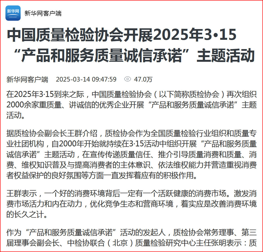 網(wǎng)易網(wǎng)報道:質(zhì)量誠信承諾助力消費環(huán)境優(yōu)化社會共治——中國質(zhì)量檢驗協(xié)會組織2025年3·15“產(chǎn)品和服務(wù)質(zhì)量誠信承諾”主題活動
