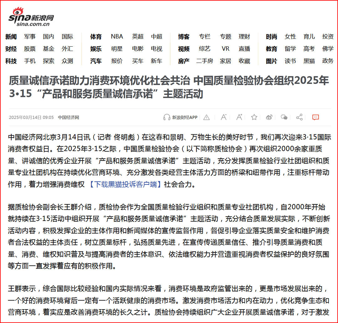 搜狐網(wǎng)報道:2025年3·15質(zhì)量誠信承諾活動助力消費環(huán)境優(yōu)化