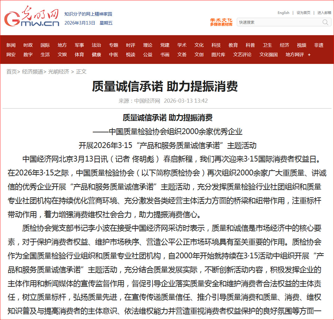 光明網(wǎng)報道:質量誠信承諾 助力提振消費——中國質量檢驗協(xié)會組織2000余家優(yōu)秀企業(yè)開展2026年3·15“產(chǎn)品和服務質量誠信承諾”主題活動