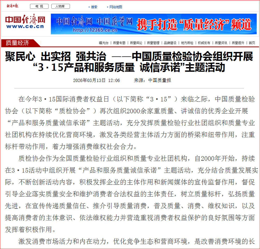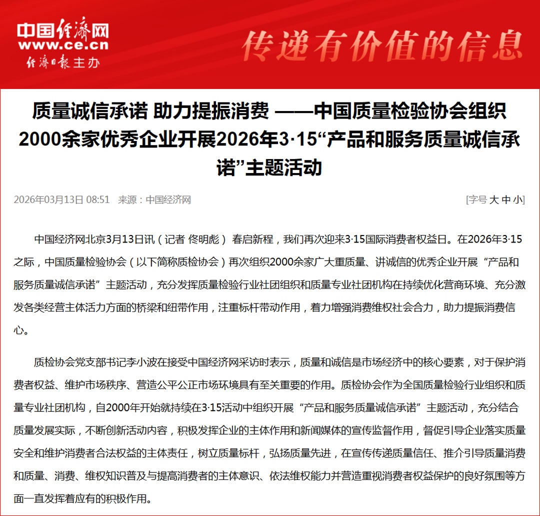 中國經(jīng)濟網(wǎng)發(fā)布:質量誠信承諾 助力提振消費——中國質量檢驗協(xié)會組織2000余家優(yōu)秀企業(yè)開展2026年3·15“產(chǎn)品和服務質量誠信承諾”主題活動