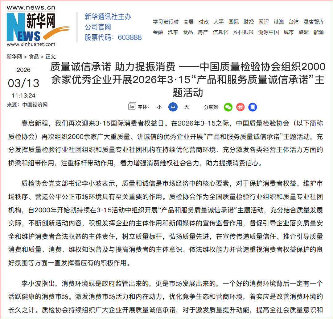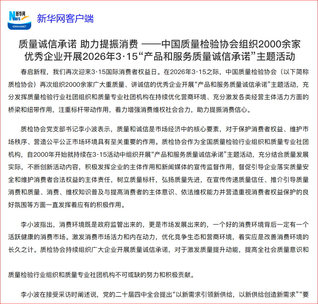 新華網(wǎng)報道:質量誠信承諾 助力提振消費——中國質量檢驗協(xié)會組織2000余家優(yōu)秀企業(yè)開展2026年3·15“產(chǎn)品和服務質量誠信承諾”主題活動