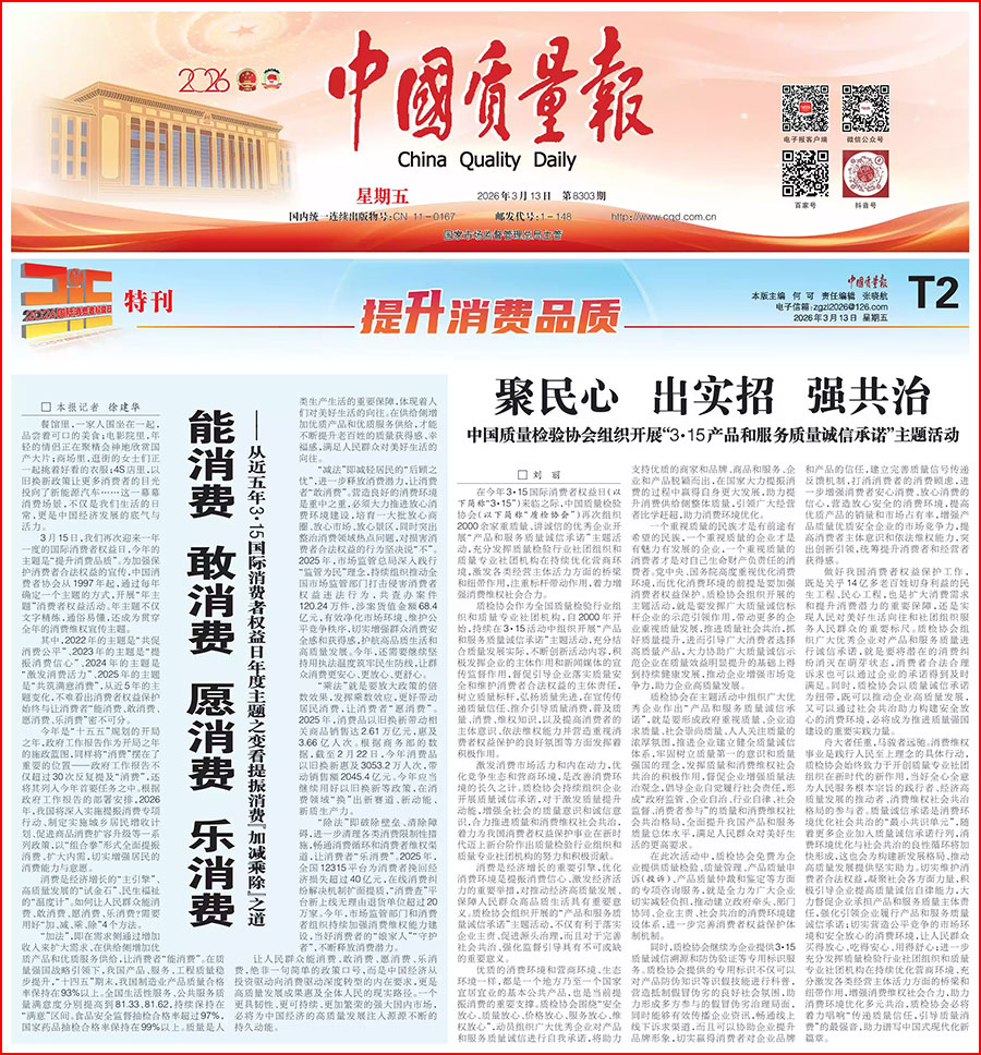 《中國質量報》(2026年3月13日刊)發(fā)布:聚民心 出實招 強共治——中國質量檢驗協(xié)會組織開展“3?15產(chǎn)品和服務質量誠信承諾”主題活動