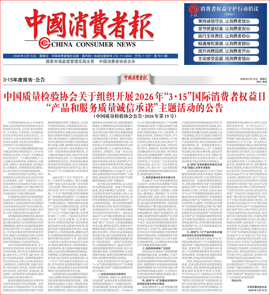 《中國消費者報》(2026年3月15日刊)發(fā)布:中國質量檢驗協(xié)會關于組織開展2026年“3·15”國際消費者權益日“產(chǎn)品和服務質量誠信承諾”主題活動的公告(中國質量檢驗協(xié)會公告·2026年第19號)
