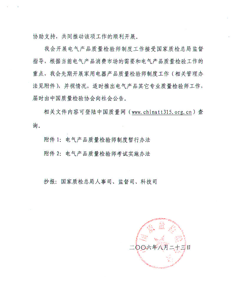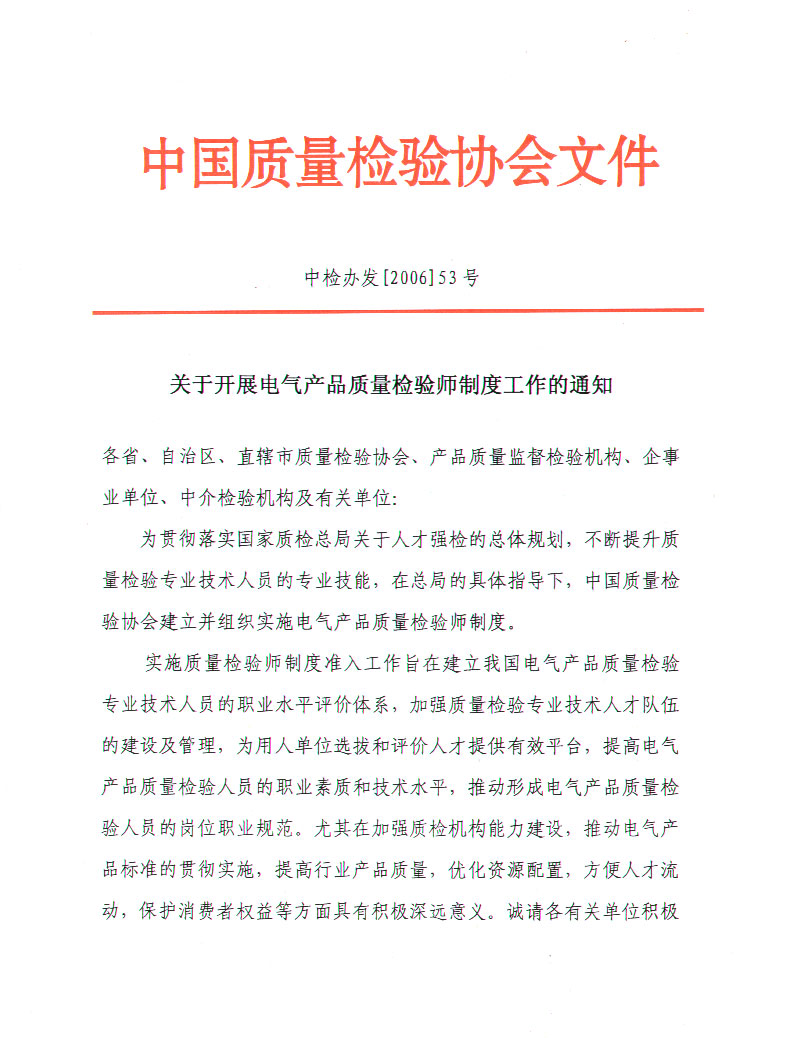 關(guān)于開展電氣產(chǎn)品質(zhì)量檢驗師制度工作的通知