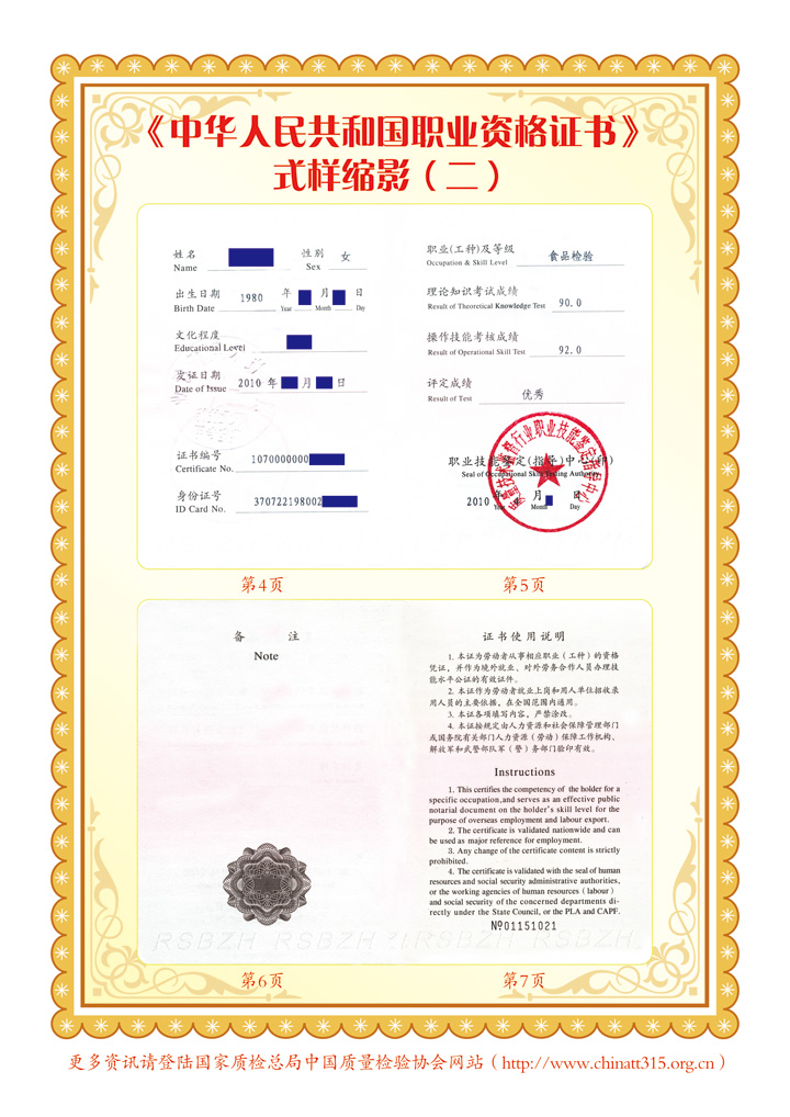 參加我會組織的培訓(xùn)并經(jīng)考試、鑒定合格者,將由(國家質(zhì)量監(jiān)督檢驗檢疫總局)質(zhì)量技術(shù)監(jiān)督行業(yè)職業(yè)技能鑒定指導(dǎo)中心頒發(fā)中華人民共和國勞動和社會保障部印制的《中華人民共和國職業(yè)資格證書》(初級、中級、高級)。《中華人民共和國職業(yè)資格證書》既是從事相關(guān)檢驗崗位人員所具備的職業(yè)技術(shù)要求和職業(yè)技能水平的資格憑證,也是用人單位技能人才評價、招收錄用和確定技能人才工資待遇的主要依據(jù),還是我國公民境外就業(yè)和輸出勞務(wù)具備法律效力公正的國家級有效證件(可應(yīng)學(xué)員要求頒發(fā)英文版本的證書)。