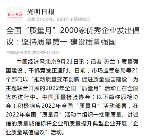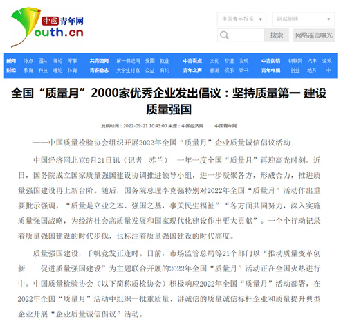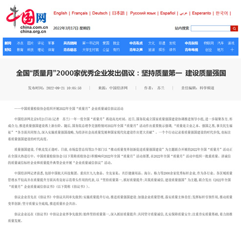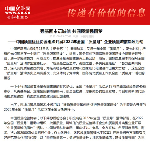 中國經(jīng)濟網(wǎng):匯聚力量攜手抓好質(zhì)量提升 肩負使命促進質(zhì)量強國建設(shè)——2022年全國“質(zhì)量月”企業(yè)質(zhì)量誠信倡議活動綜述
