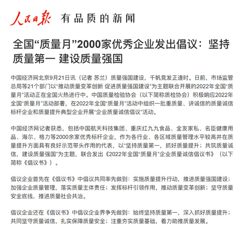 人民網(wǎng):全國“質(zhì)量月”2000家優(yōu)秀企業(yè)發(fā)出倡議:堅持質(zhì)量第一 建設(shè)質(zhì)量強國