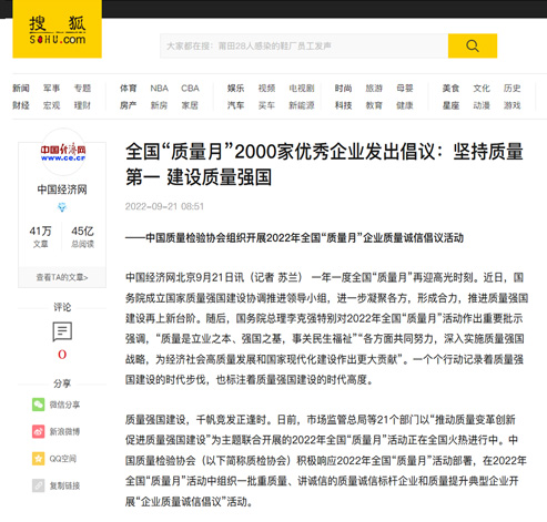搜狐網(wǎng):全國“質(zhì)量月”2000家優(yōu)秀企業(yè)發(fā)出倡議:堅持質(zhì)量第一 建設(shè)質(zhì)量強國