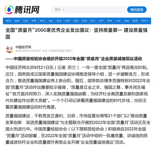 騰訊網(wǎng):全國“質(zhì)量月”2000家優(yōu)秀企業(yè)發(fā)出倡議:堅持質(zhì)量第一 建設(shè)質(zhì)量強國