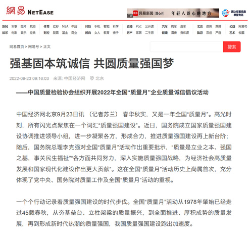網(wǎng)易網(wǎng):強基固本筑誠信 共圓質(zhì)量強國夢——中國質(zhì)量檢驗協(xié)會組織開展2022年全國“質(zhì)量月”企業(yè)質(zhì)量誠信倡議活動