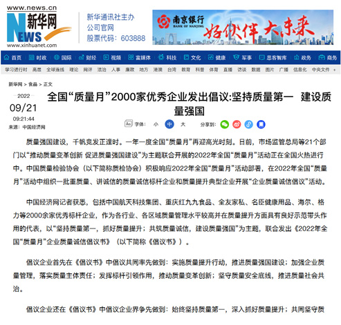 新華網(wǎng):全國“質(zhì)量月”2000家優(yōu)秀企業(yè)發(fā)出倡議:堅持質(zhì)量第一 建設(shè)質(zhì)量強國