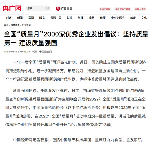 中央廣播電視總臺央廣網(wǎng):全國“質(zhì)量月”2000家優(yōu)秀企業(yè)發(fā)出倡議:堅持質(zhì)量第一 建設(shè)質(zhì)量強國