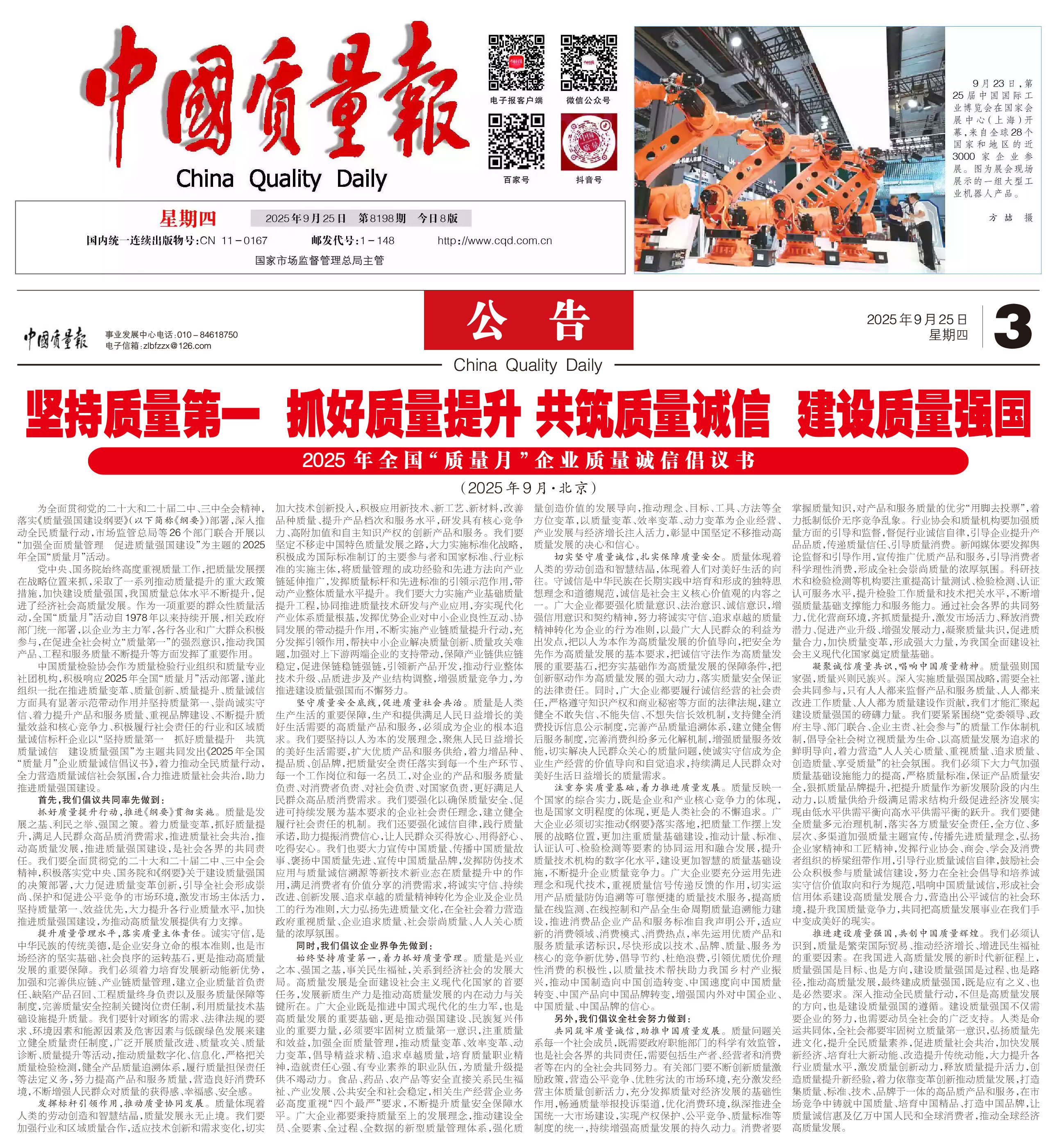 - 《中國質(zhì)量報》(2025年9月25日刊)發(fā)布:堅持質(zhì)量第一 抓好質(zhì)量提升 共筑質(zhì)量誠信 建設(shè)質(zhì)量強國——2025年全國“質(zhì)量月”企業(yè)質(zhì)量誠信倡議書(2025年9月·北京)