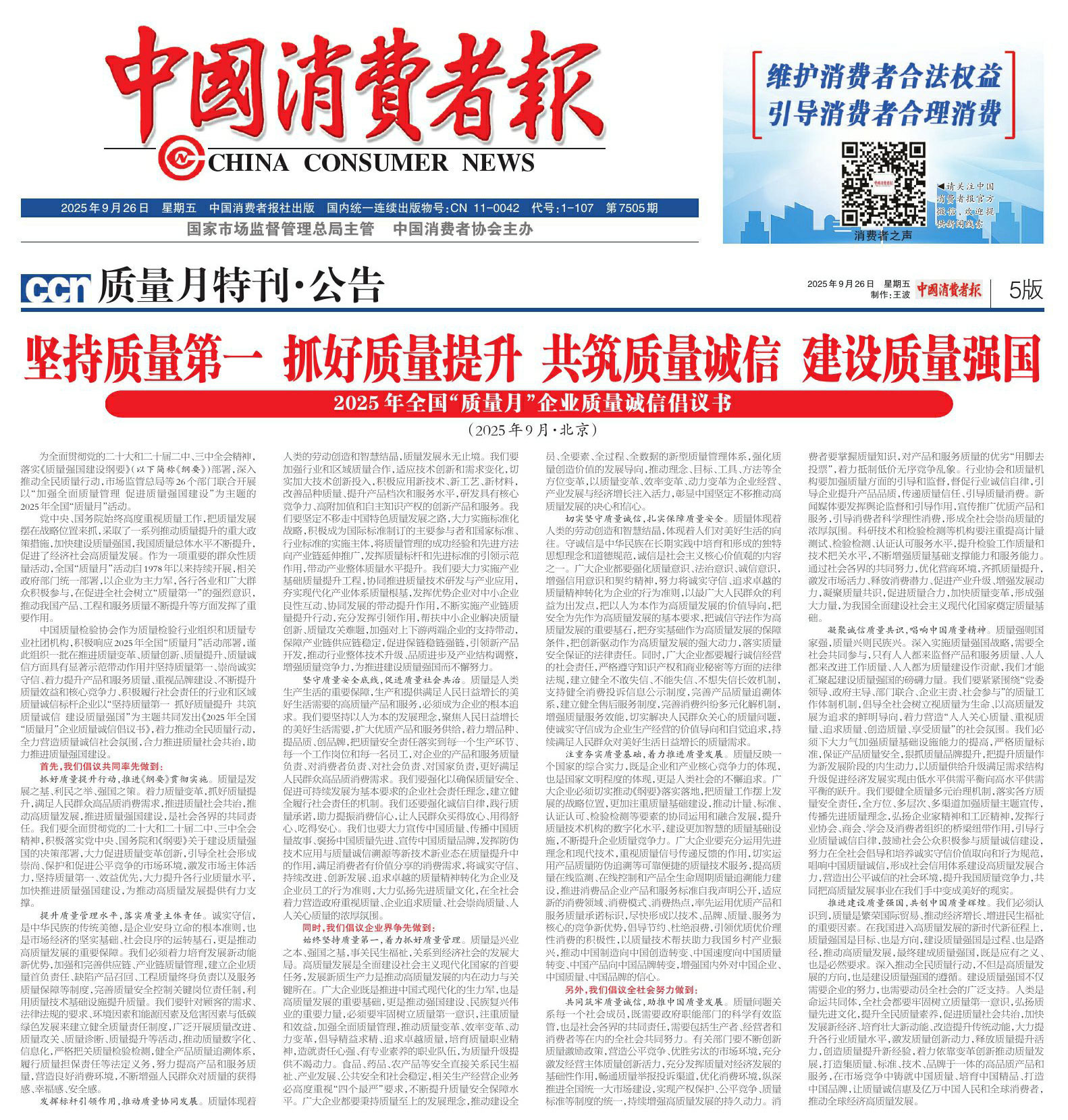 - 《中國質(zhì)量報》(2025年9月26日刊)發(fā)布:堅持質(zhì)量第一 抓好質(zhì)量提升 共筑質(zhì)量誠信 建設(shè)質(zhì)量強國——2025年全國“質(zhì)量月”企業(yè)質(zhì)量誠信倡議書(2025年9月·北京)