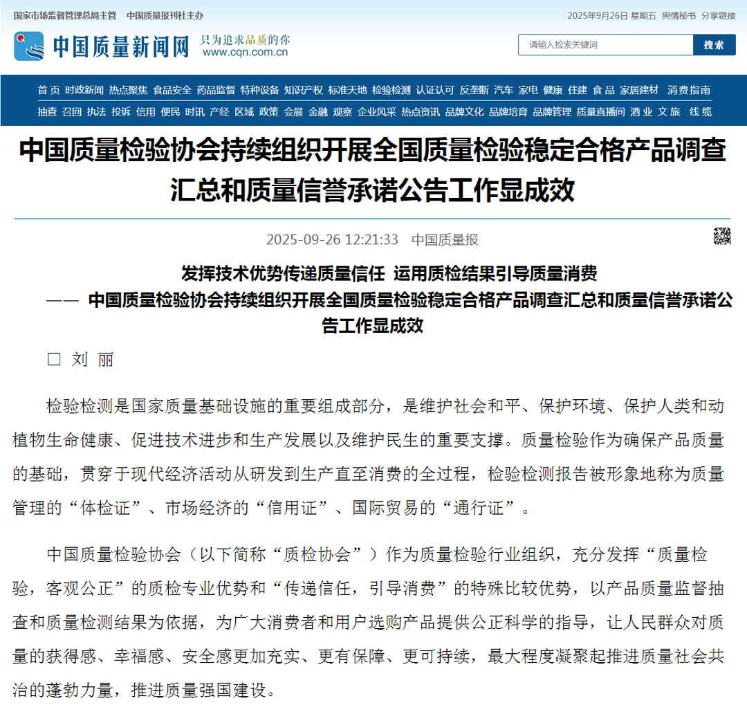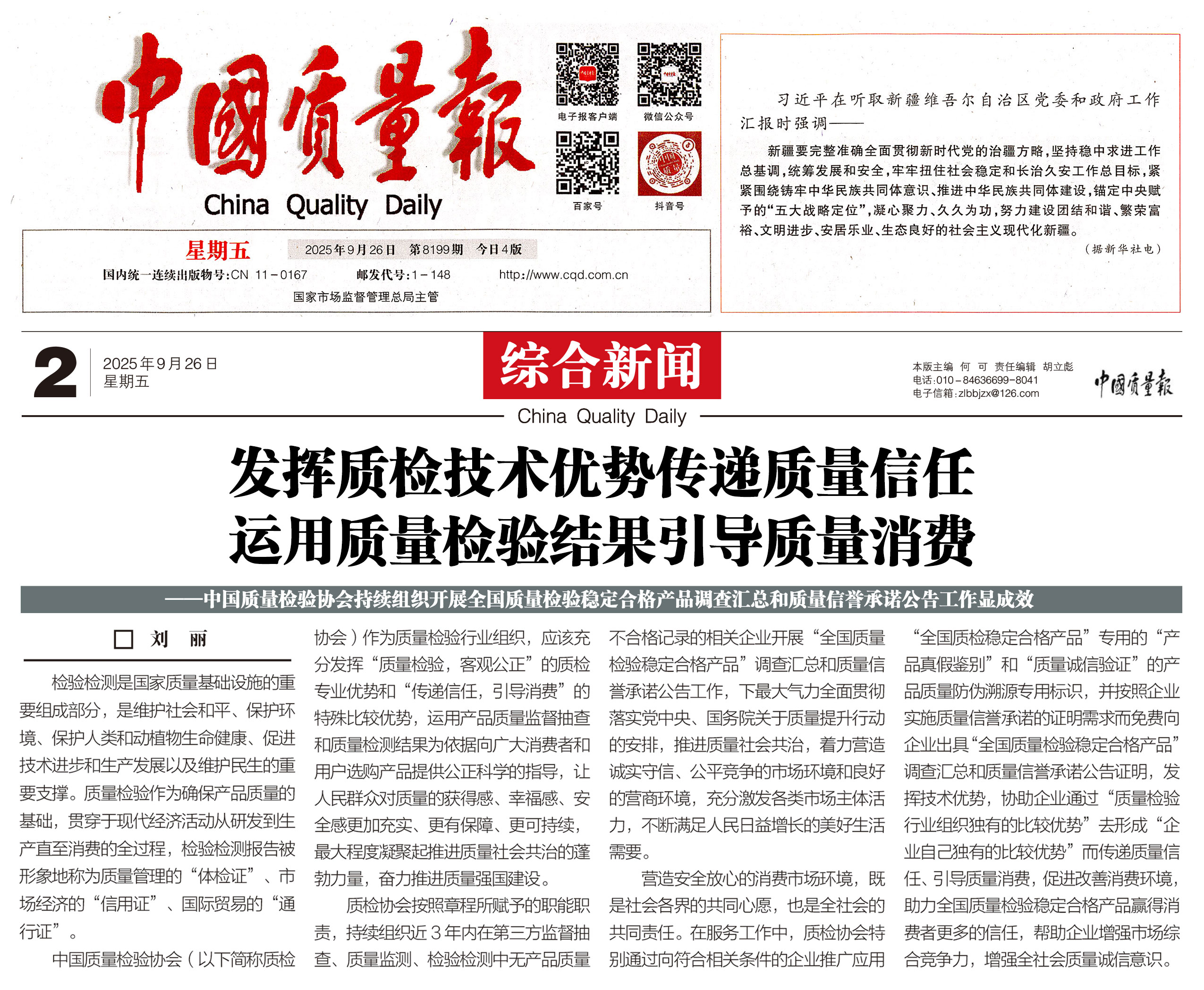 - 《中國質(zhì)量報》(2025年9月26日刊)發(fā)布:發(fā)揮技術(shù)優(yōu)勢傳遞質(zhì)量信任 運用質(zhì)檢結(jié)果引導(dǎo)質(zhì)量消費————中國質(zhì)量檢驗協(xié)會持續(xù)組織開展全國質(zhì)量檢驗穩(wěn)定合格產(chǎn)品調(diào)查匯總和質(zhì)量信譽承諾公告工作顯成效