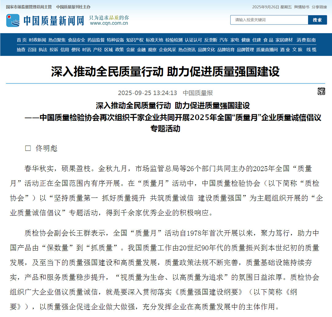 - 《中國質(zhì)量報》(2025年9月25日刊)發(fā)布:深入推動全民質(zhì)量行動 助力促進(jìn)質(zhì)量強國建設(shè)——中國質(zhì)量檢驗協(xié)會再次組織千家企業(yè)共同開展2025年全國“質(zhì)量月”企業(yè)質(zhì)量誠信倡議專題活動